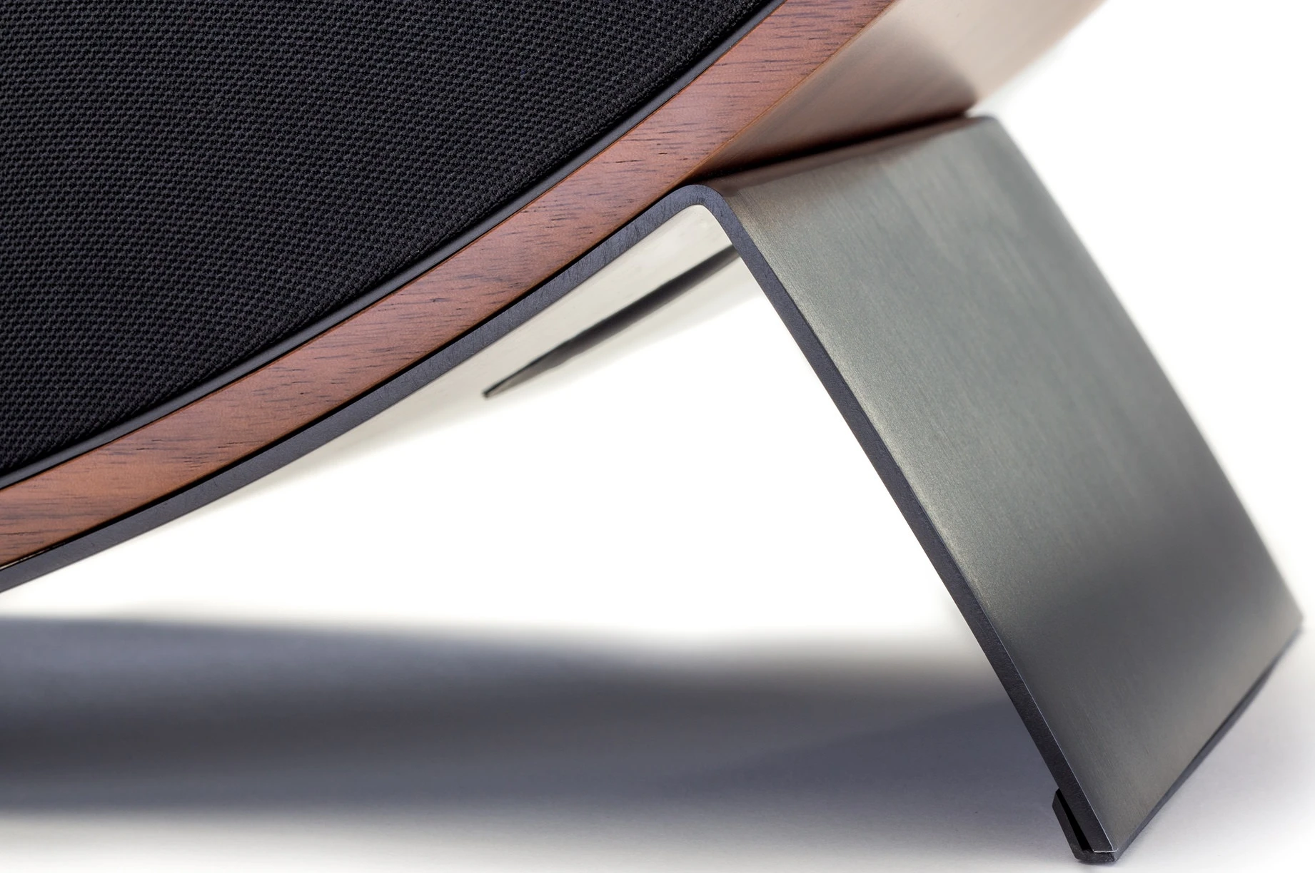 piano black paint or real-wood walnut veneer, floats atop a sturdy aluminum