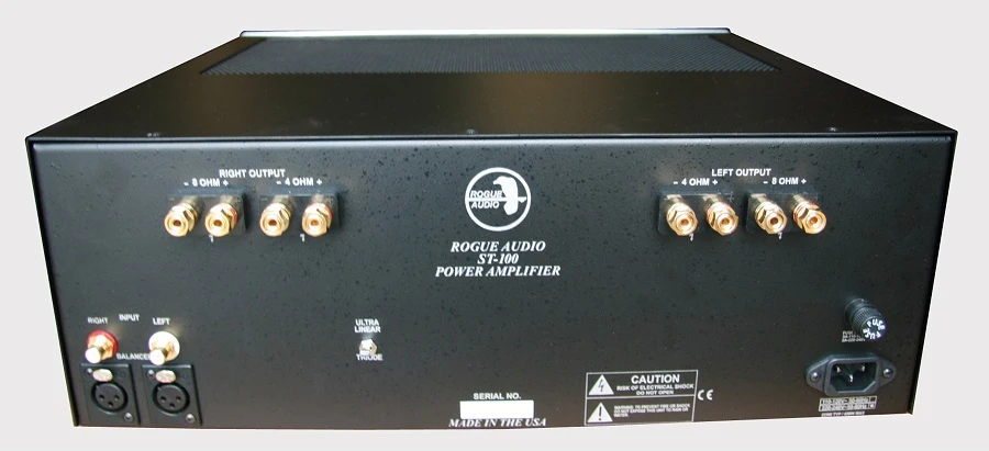 Whether your tastes run to the delicate strains of the violin or the wail of the electric guitar, the Rogue Stereo 100 power amplifier will thrill you with its precision, musicality, and impact. And with 100 watts of pure tube power, you can be sure that your amplifier wonβt run out of steam before the musicians do. The heart of the Stereo 100 consists of four matched KT120 output tubes operating in push-pull configuration. A massive fully regulated power supply ensures that low frequency information will not go unheard, and that the power and attack of transient musical passages will be recreated in full. And with a simple flip of a switch, audiophiles can choose between βpure triodeβ and βultra-linearβ operation to suit their tastes and power requirements. The transparency and power of the Stereo 100 is testimony to a design that truly transcends that of the competition.