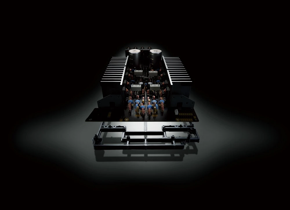 Notice the custom made power transformer, custom made block capacitors, two direct signal path speaker relays, one point grounding system, extruded aluminum heat sinks and other top quality parts to effortlessly handle demanding audio conditions. The quality of each individual part, as well as how they work together, basically determines the sound quality of this component. Yamaha uses only very high quality parts, carefully selected and tested for their sound properties.